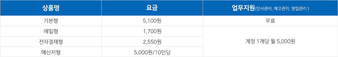 | 상품명 | 요금 | 업무지원 (인사관리, 재고관리, 영업관리) |