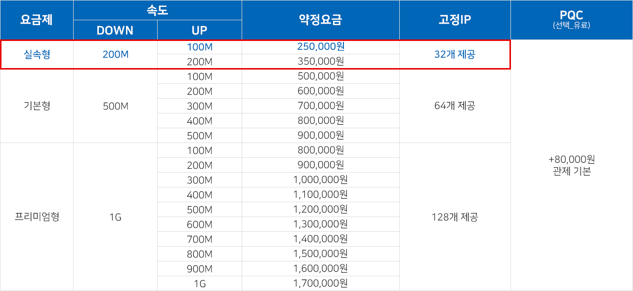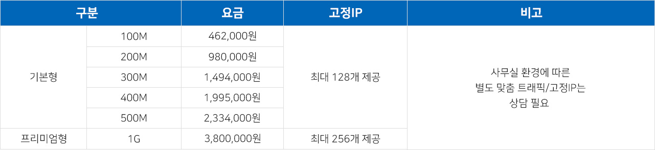 기본형 100M 462,000원 최대 128개 제공 사무실 환경에 따른 별도 맞춤 트래픽/고정IP는 상담 필요