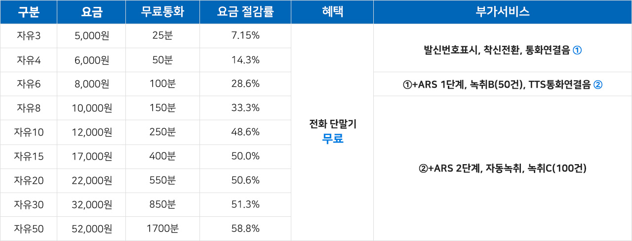 | 자유6 | 8,000원 | 100분 | 28.6% | ①+ARS 1단계, 녹취B(50건), TTS통화연결음 ② | |
