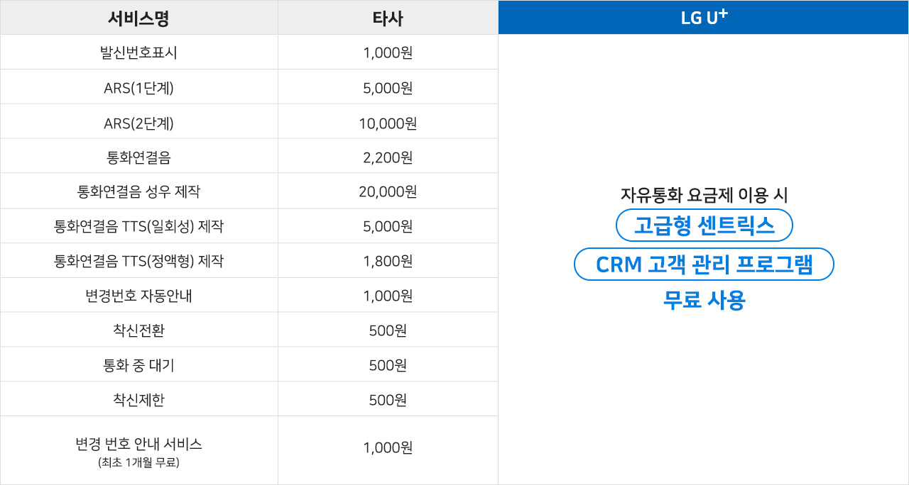 | 발신번호표시 | 1,000원 | 자유통화 요금제 이용 시 고급형 센트릭스 CRM 고객 관리 프로그램 무료 사용 |